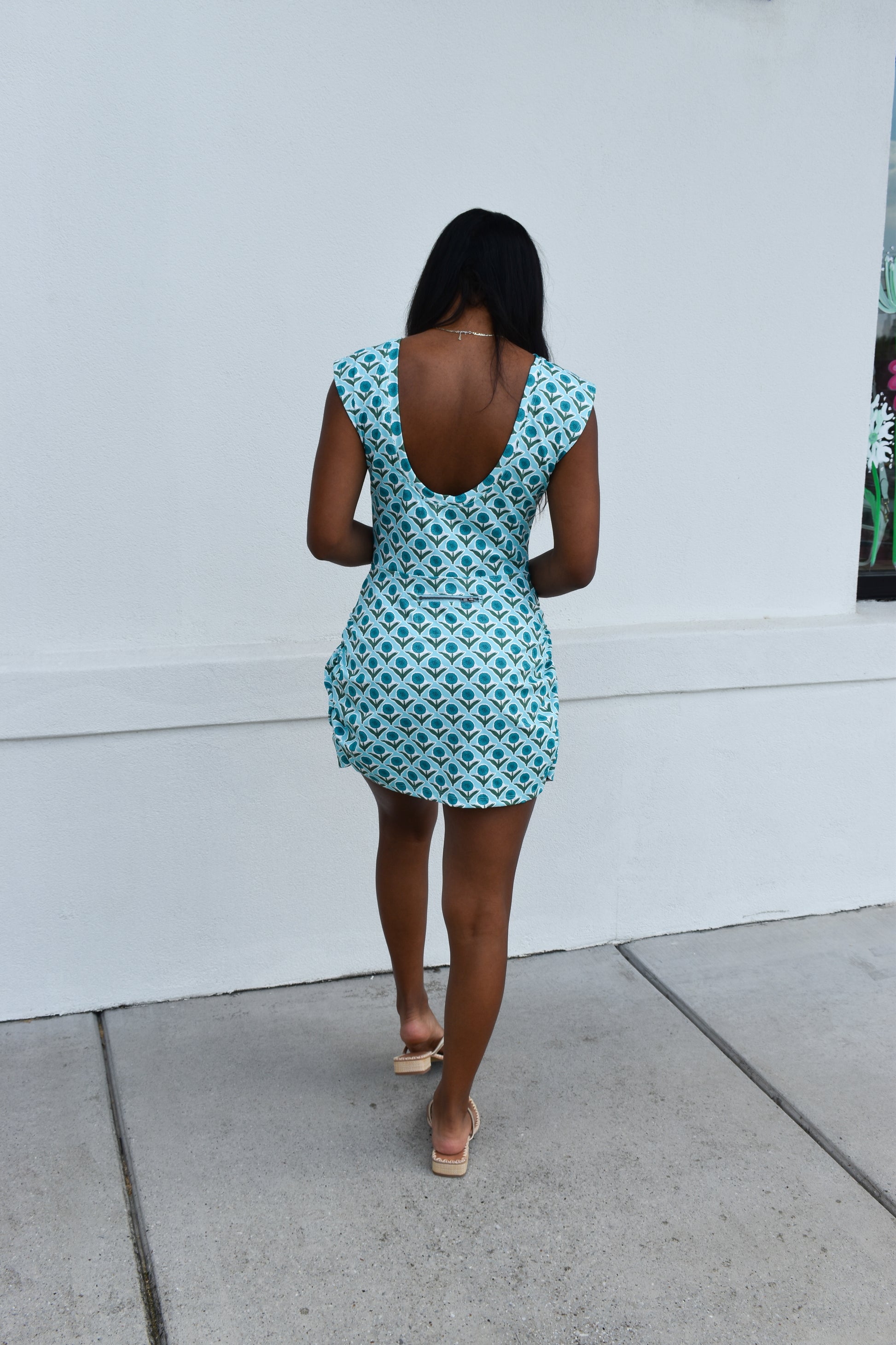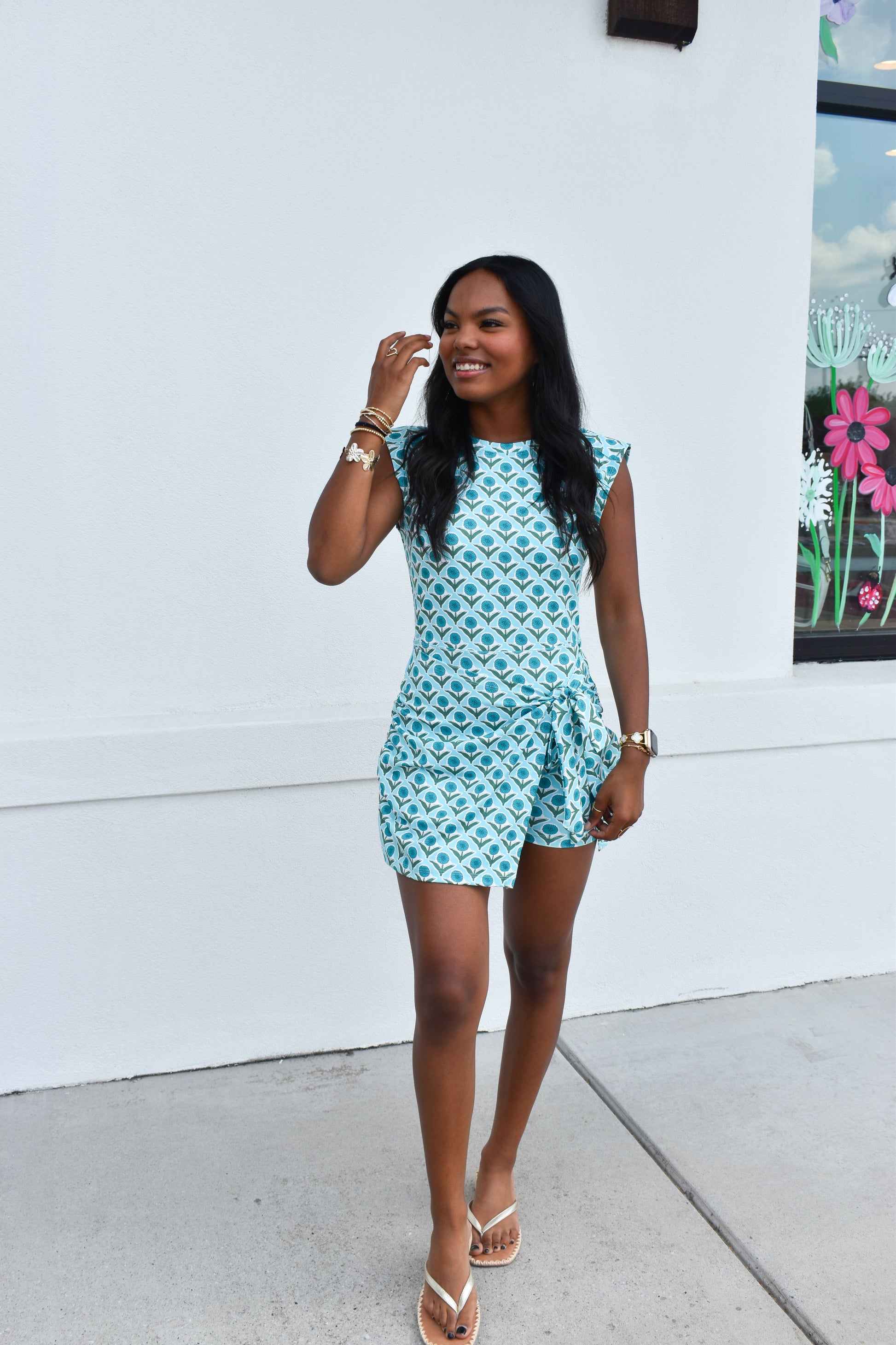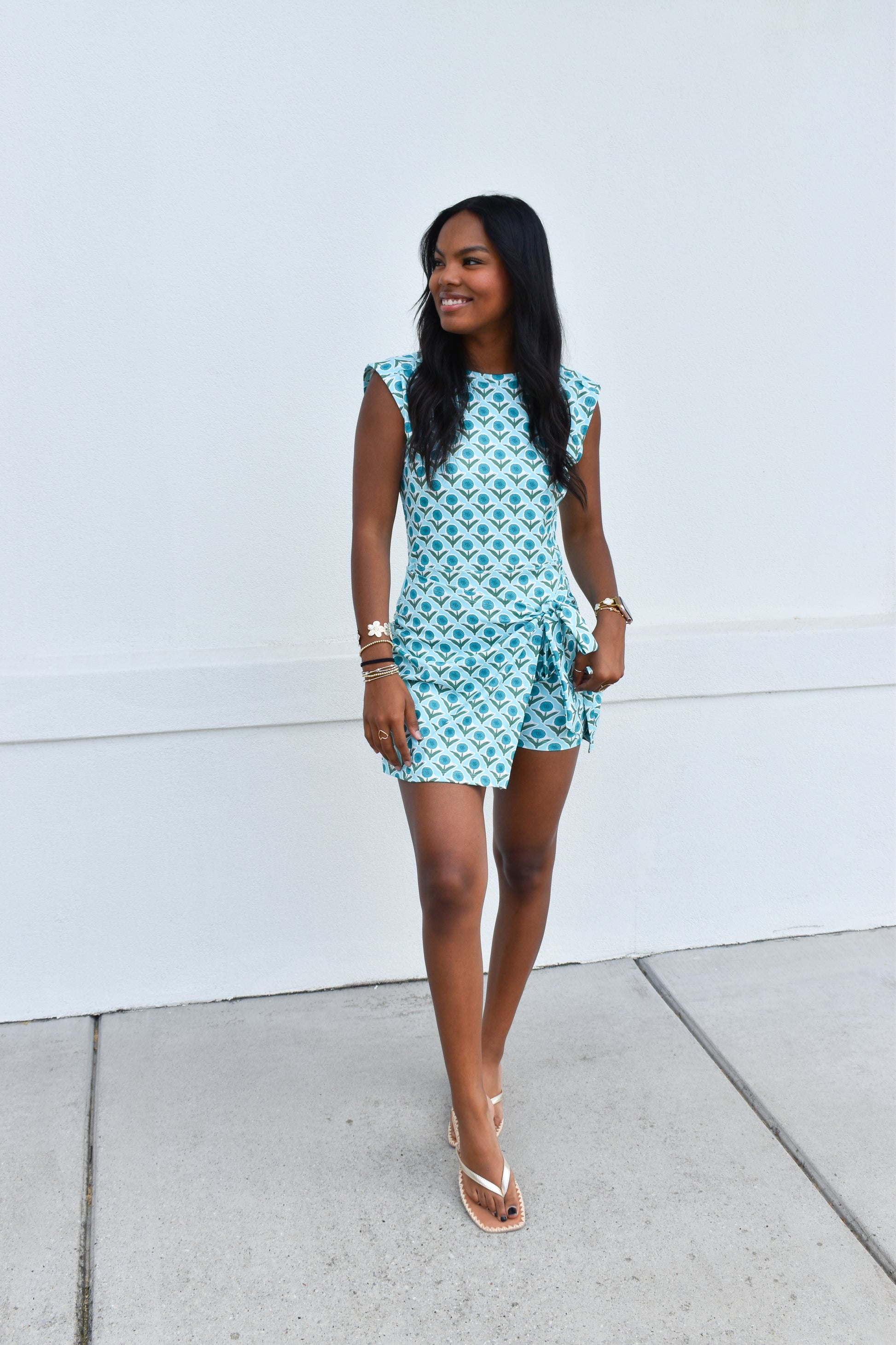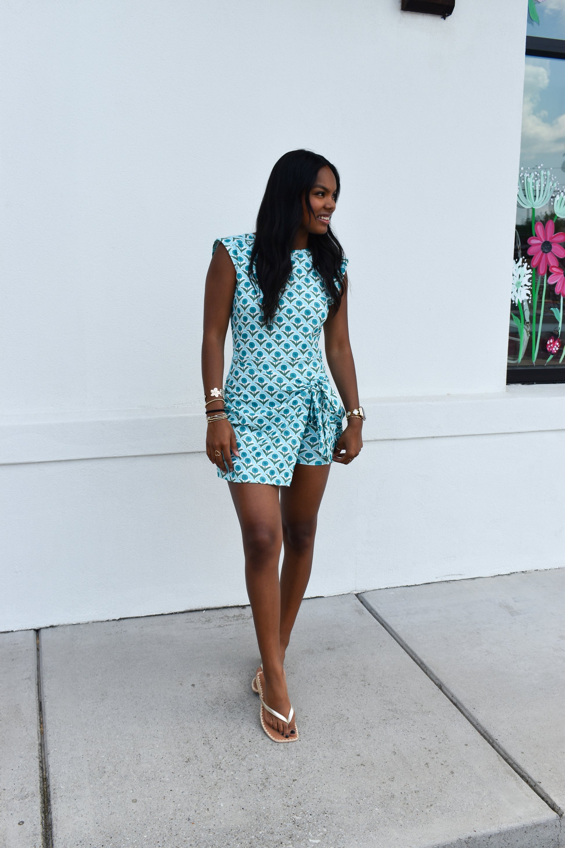 This sleeveless dress features a bold retro floral print, built-in shorts, and a wrap-style skirt overlay.