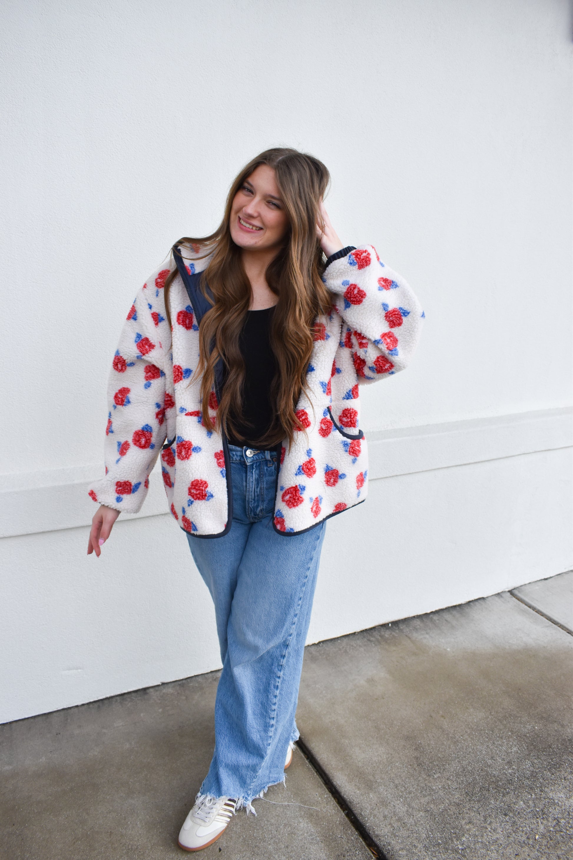 Cozy Oversized Rose Pattern Fleece Zip Up Jacket