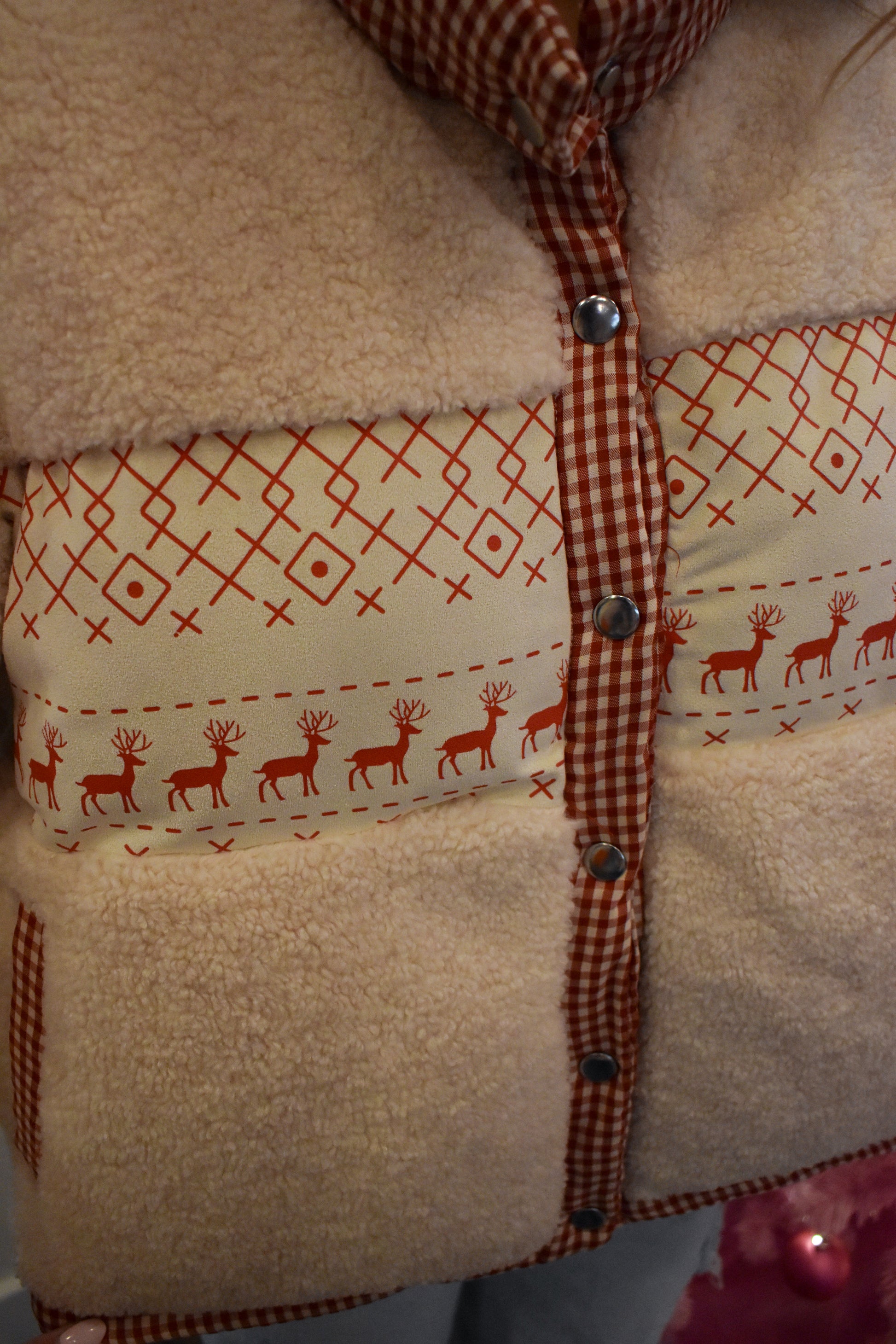 Cozy Sherpa Jacket with Gingham Lining and Holiday Trim