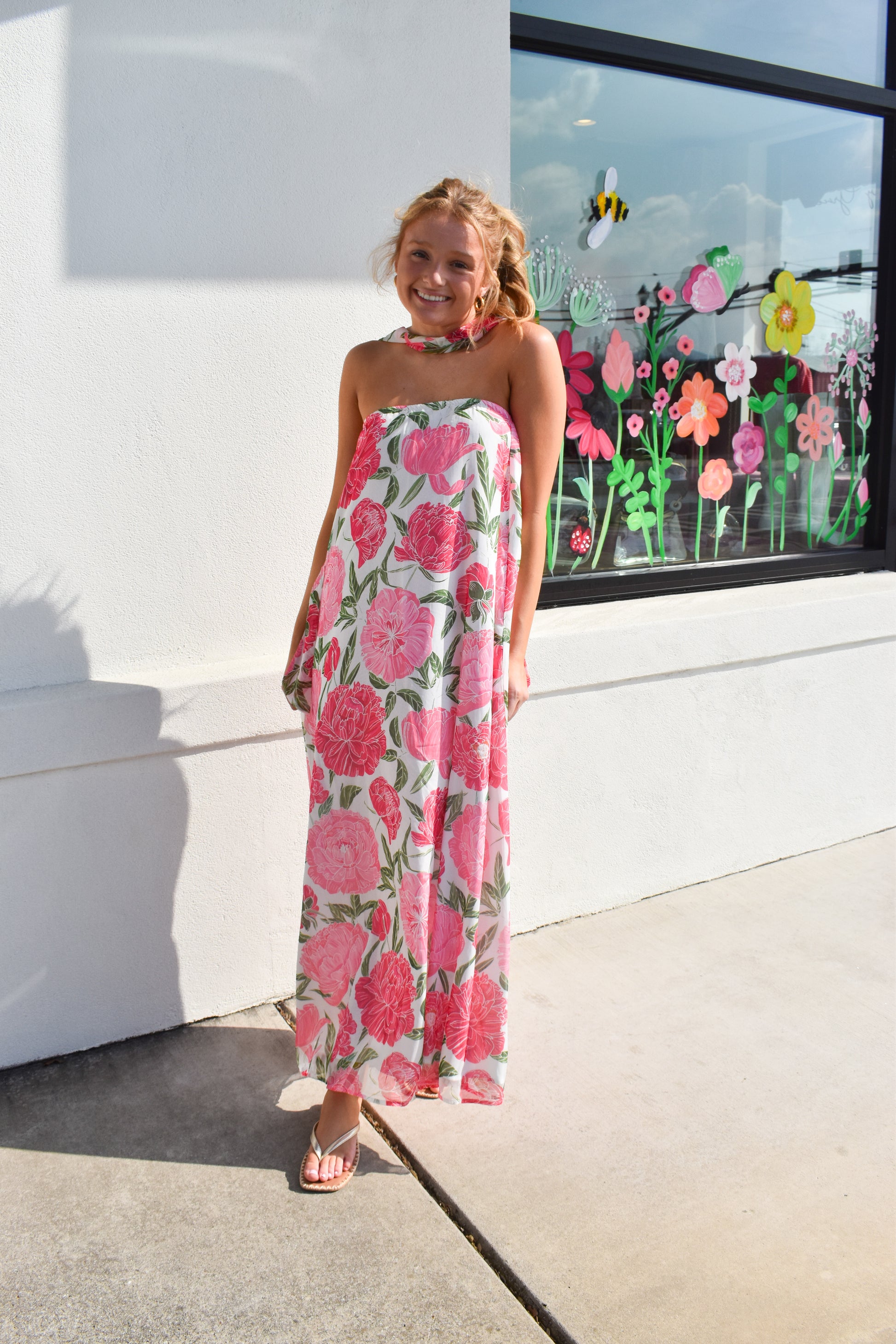 Floral Strapless Maxi Dress W/ Convertible Scarf