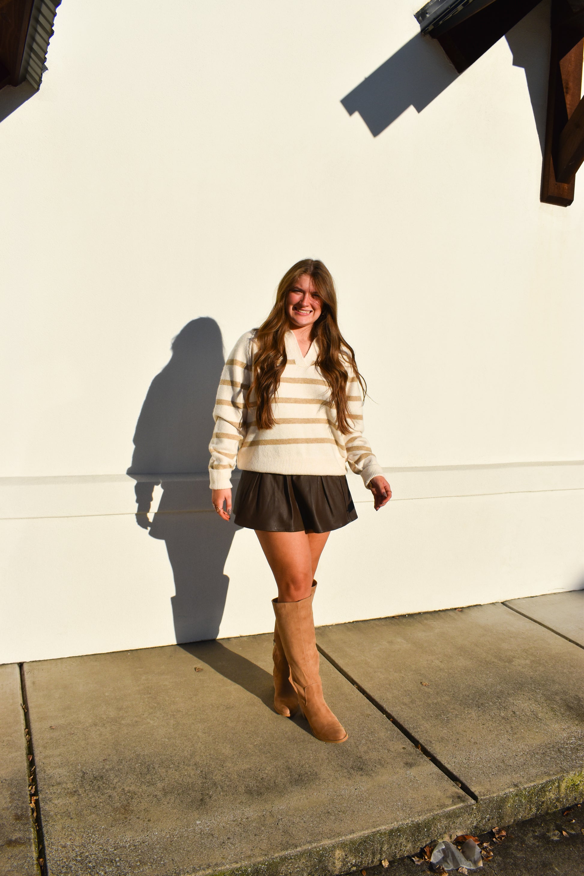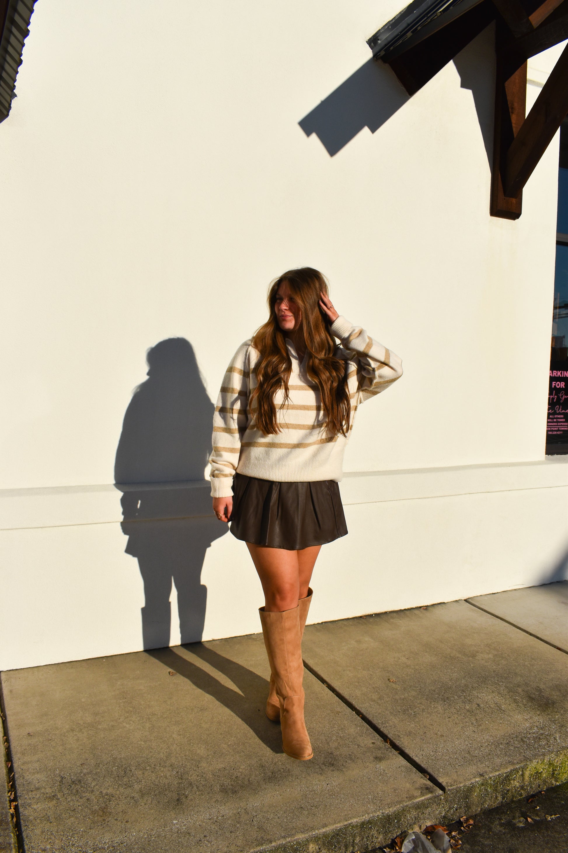 MID RISE PLEAT BROWN PU SKIRTS VEGAN LEATHER STRETCH REGULAR HEM EXPOSED METAL ZIPPER WB WITH SNAP BUTTON PLEAT DETAIL RISE 15" IN SIZE M 100% PU/ 100% POLY BACKING 360 GSM