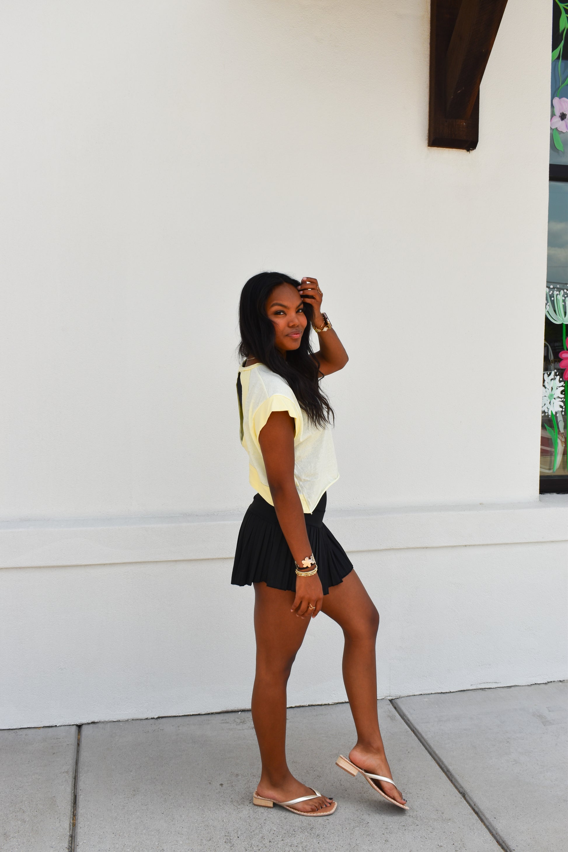 Trendy tennis skirt with built-in shorts. Made of moisture-wicking material. 85% Polyester, 15% Spandex INSEAM S: 13" M: 13 1/2" L: 14"