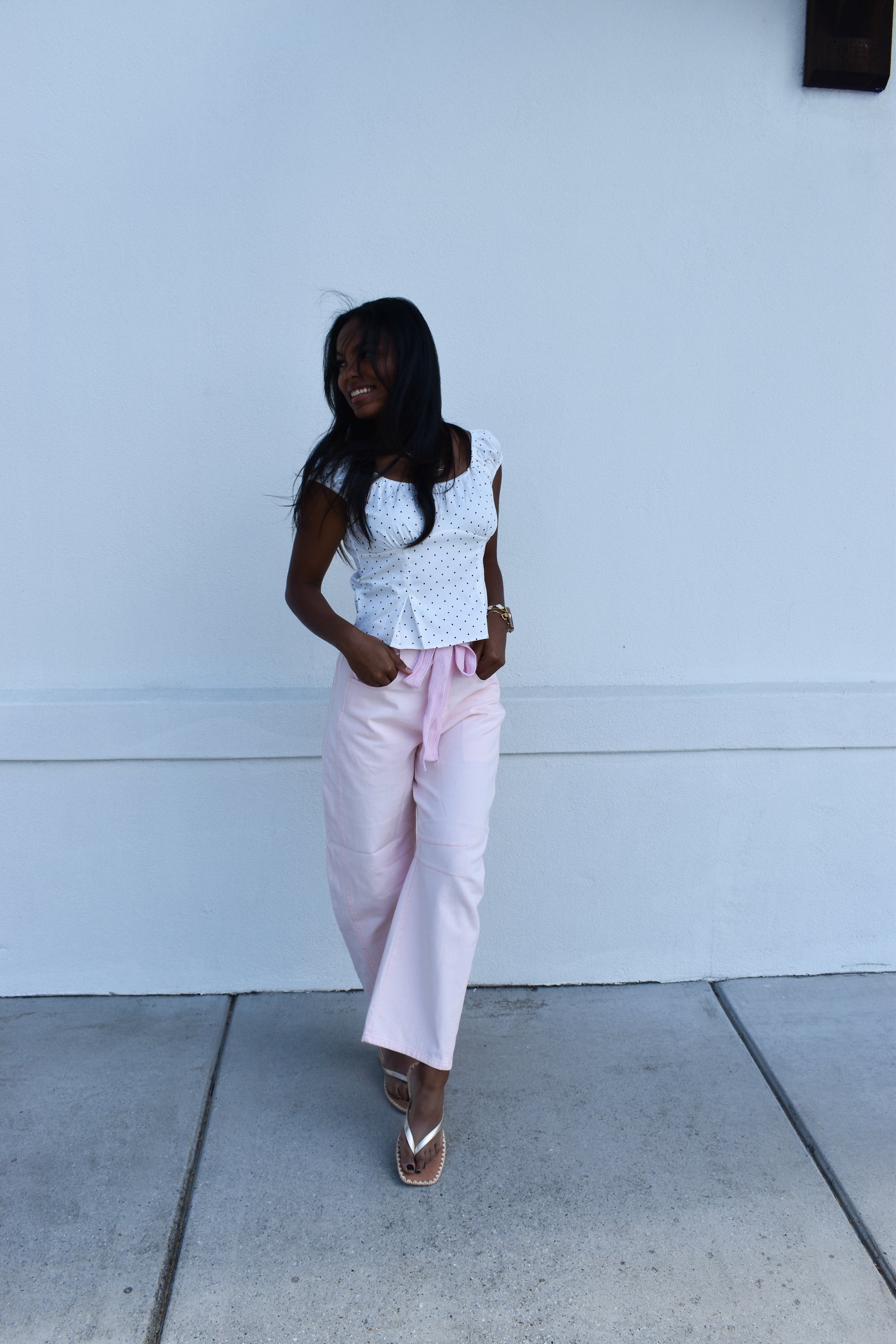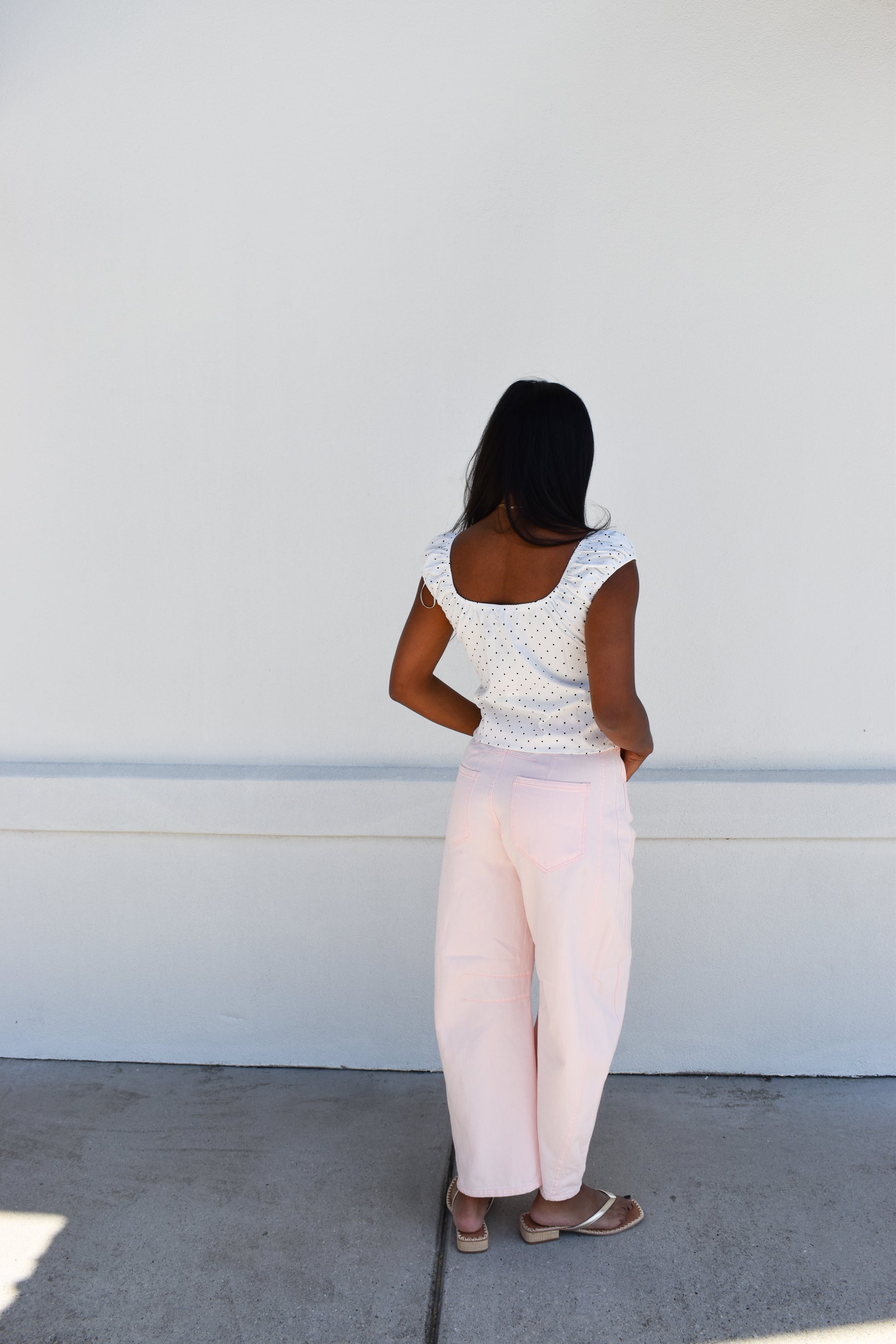 Polka Dot Peplum Top This lightweight top features a soft scoop neckline with gentle gathers and a subtle peplum hem for a flattering feminine shape. Designed with a playful polka dot pattern and an easy silhouette that feels light and effortless. - Soft scoop neckline - Gathered bust detail - Short cap sleeves - Polka dot pattern - Flared peplum hem - Relaxed comfortable fit Perfect For - Casual everyday wear - Warm weather styling - Weekend outings - Easy feminine looks Fabric Content: 100% POLYESTER