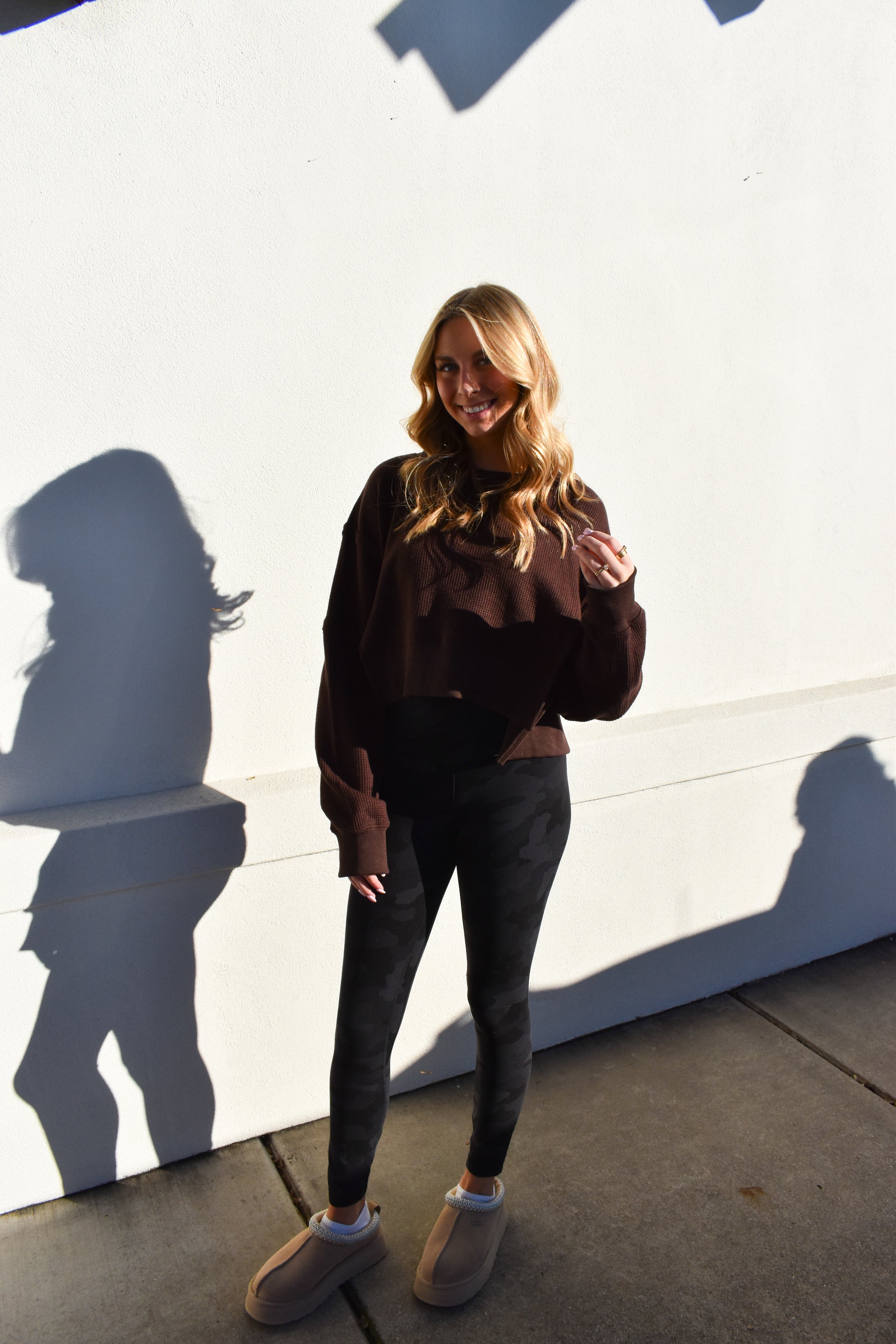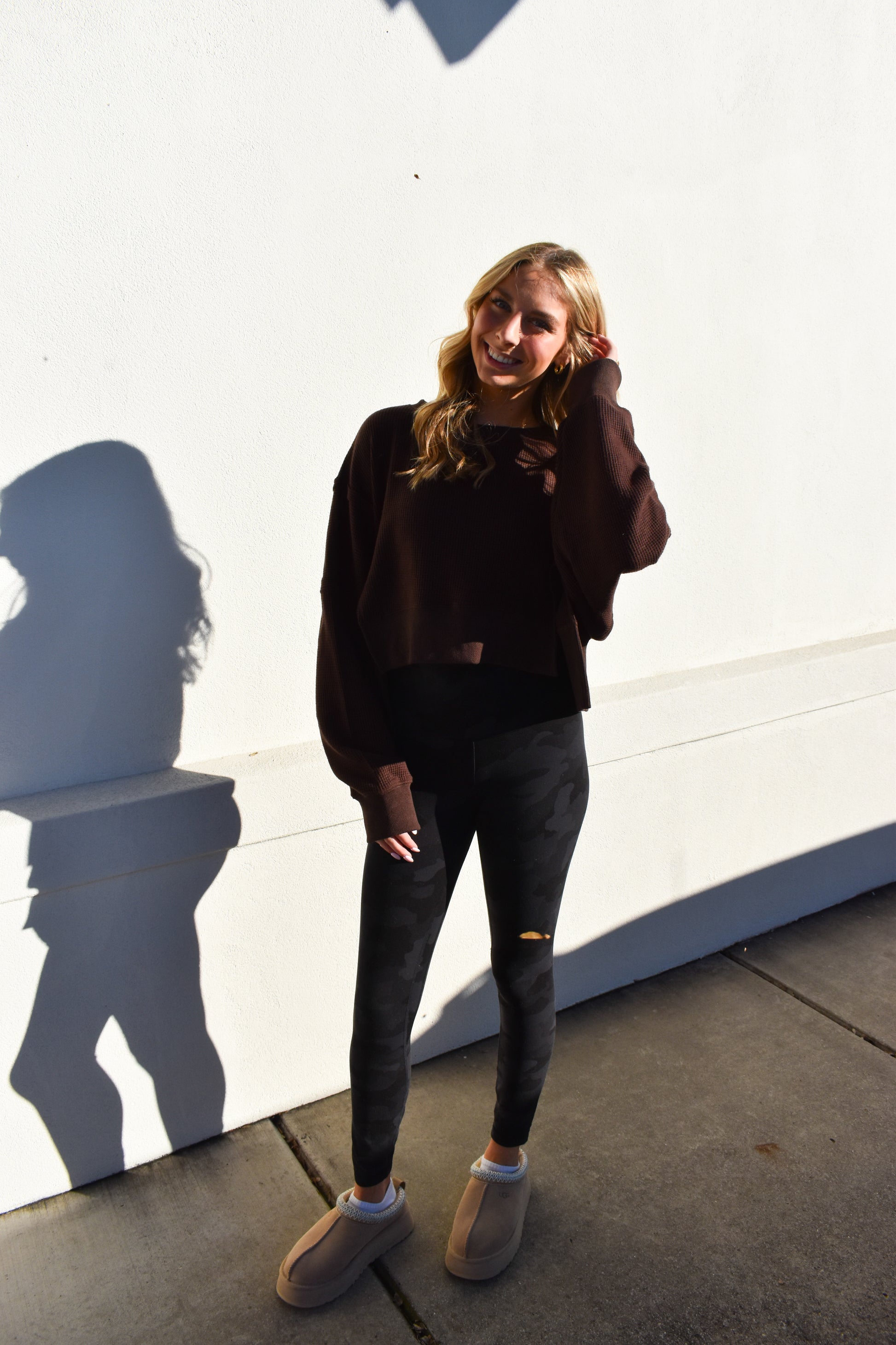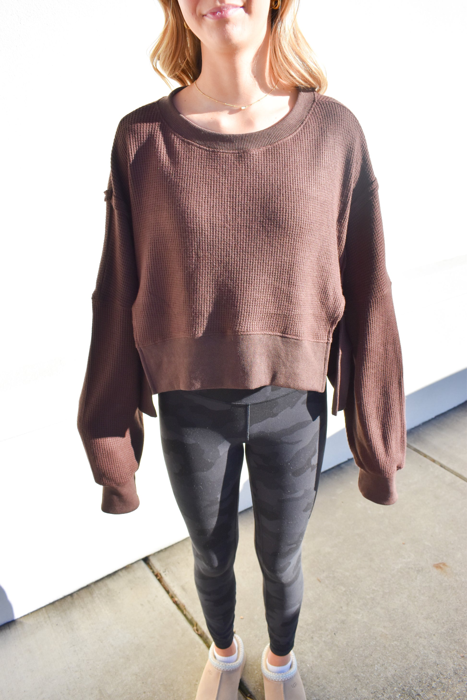 Waffle Knit Oversized Long Sleeve Top: Brown